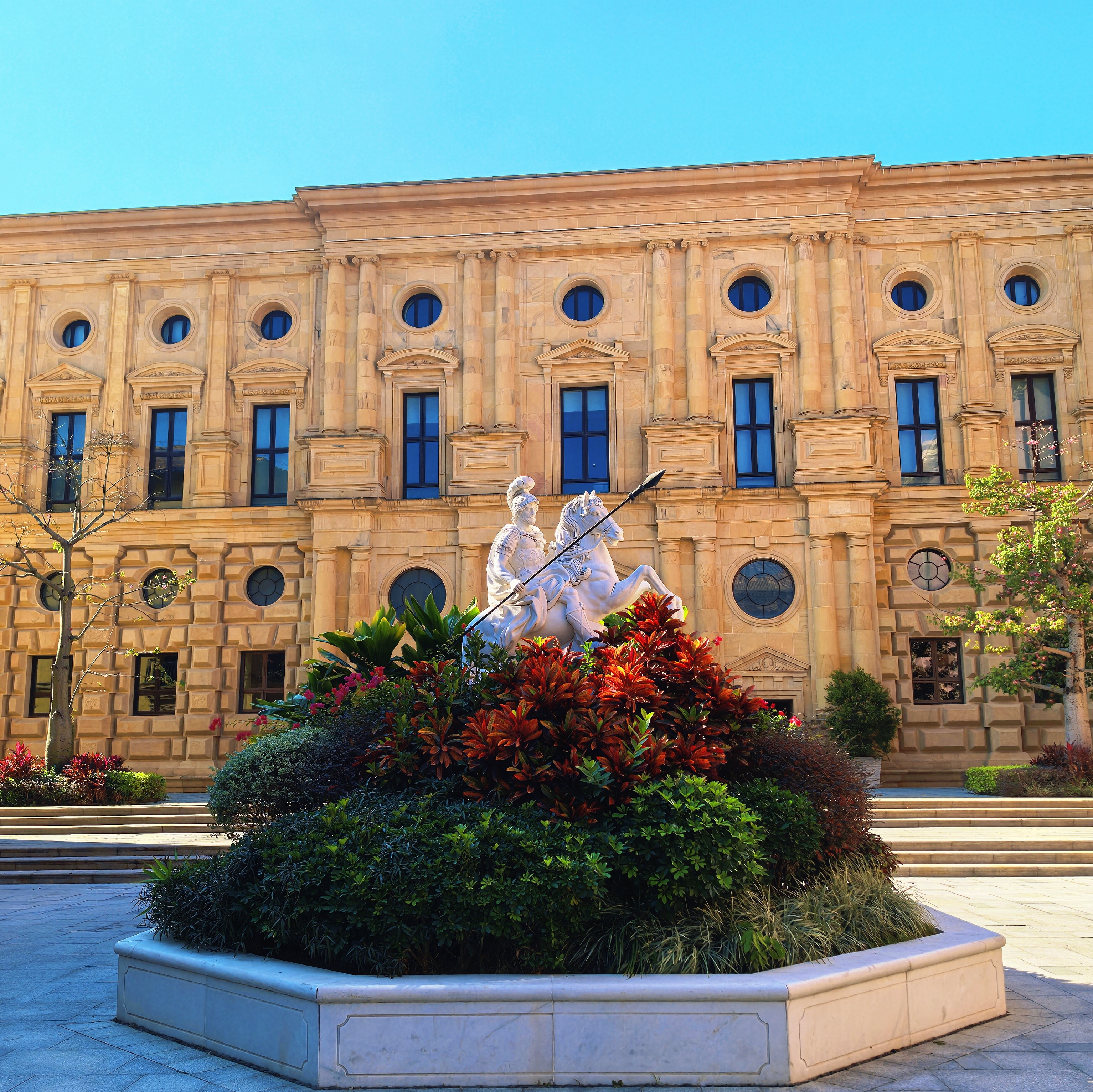 除了各式各样的建筑之外,园区内的绿化和植被也相当不错。五彩滨纷的花坛被摆放在广场的中央,衬托着白玉般的雕像,楼边随处可见葱郁的绿植,为枯燥的打工生活增加了一丝绿意。午饭后,我总会和同事们在园内散步消食,沐浴冬日的暖阳,感受微风拂过脸庞,是为数不多能在打工间隙完全放松下来的时刻。
