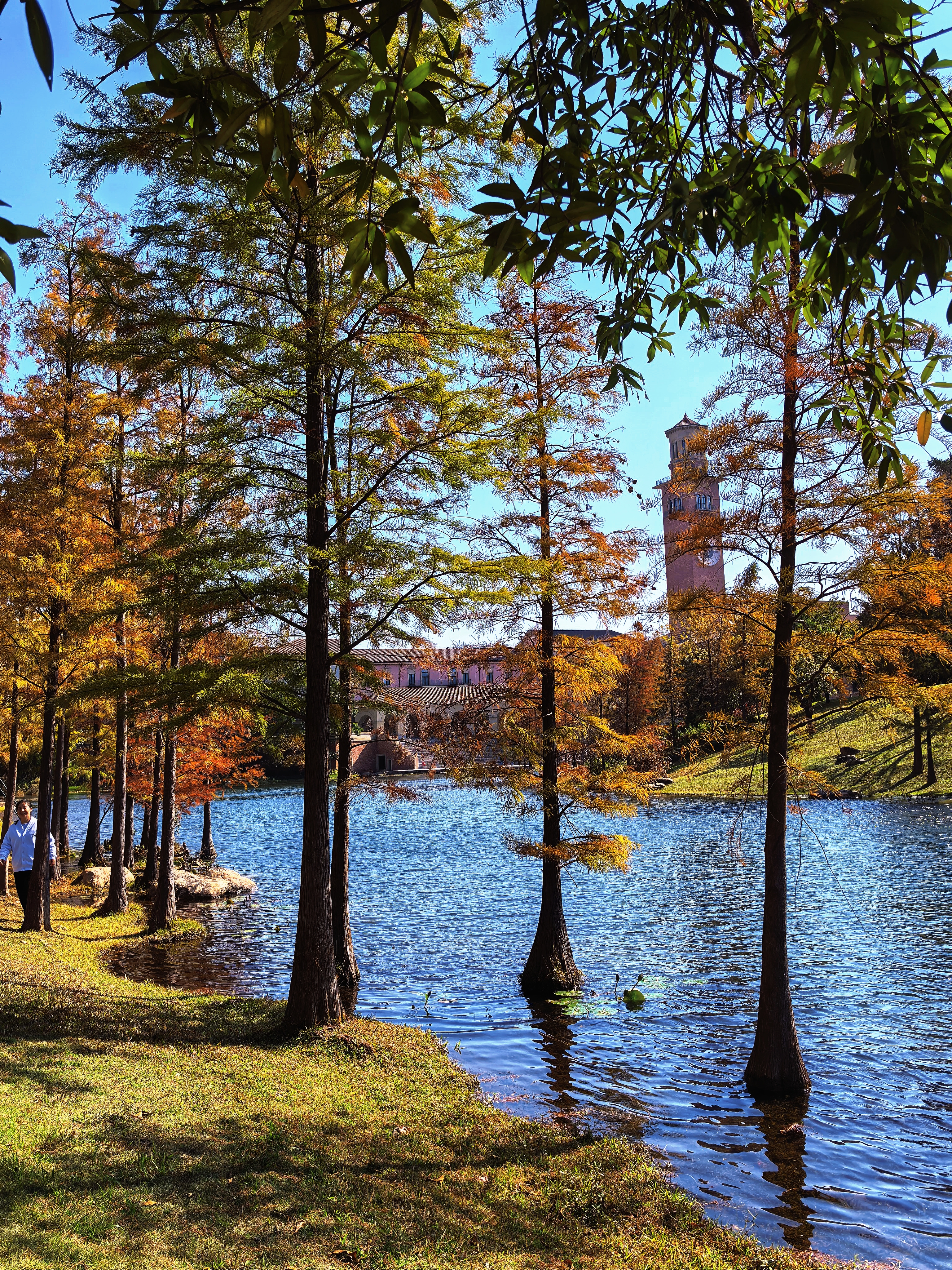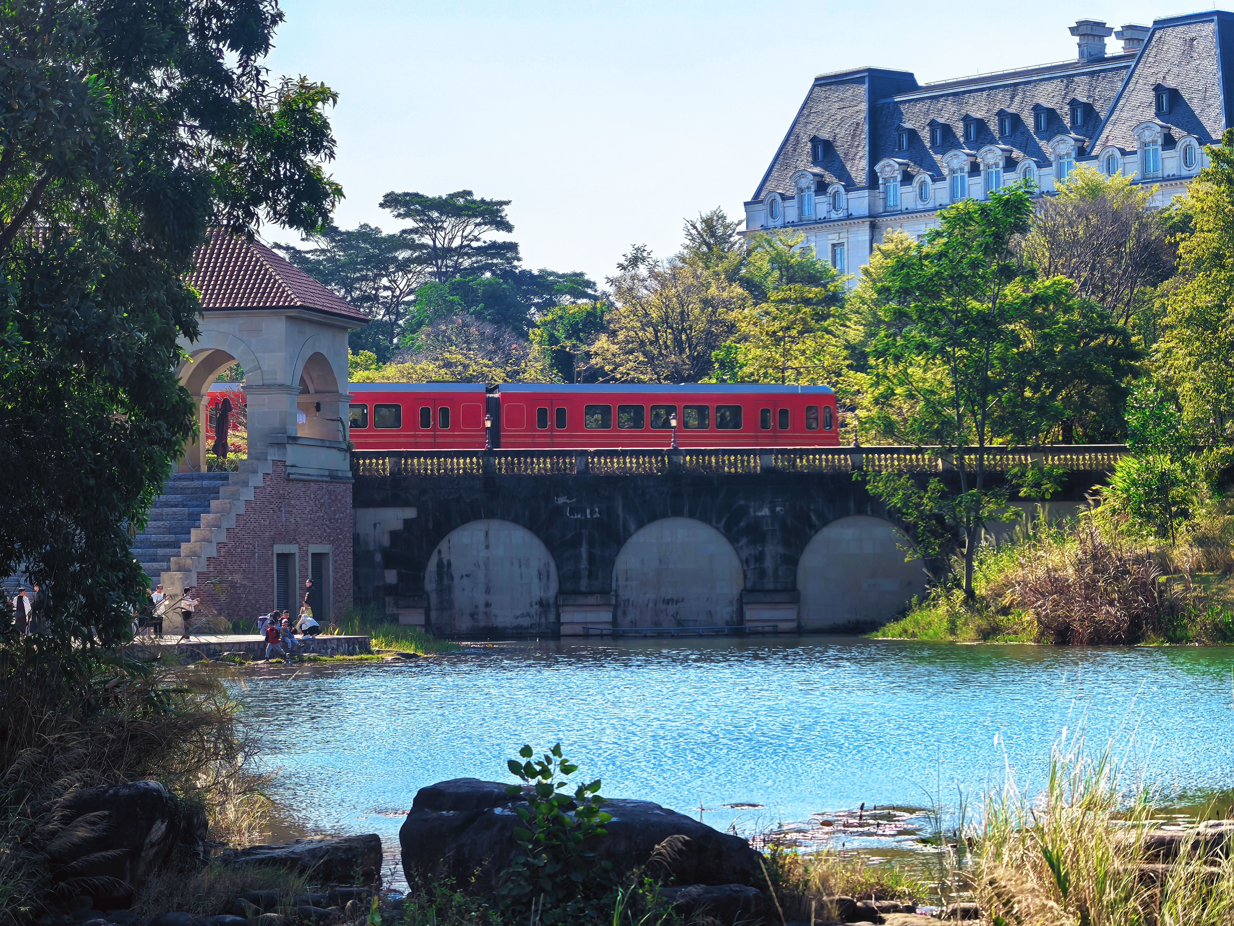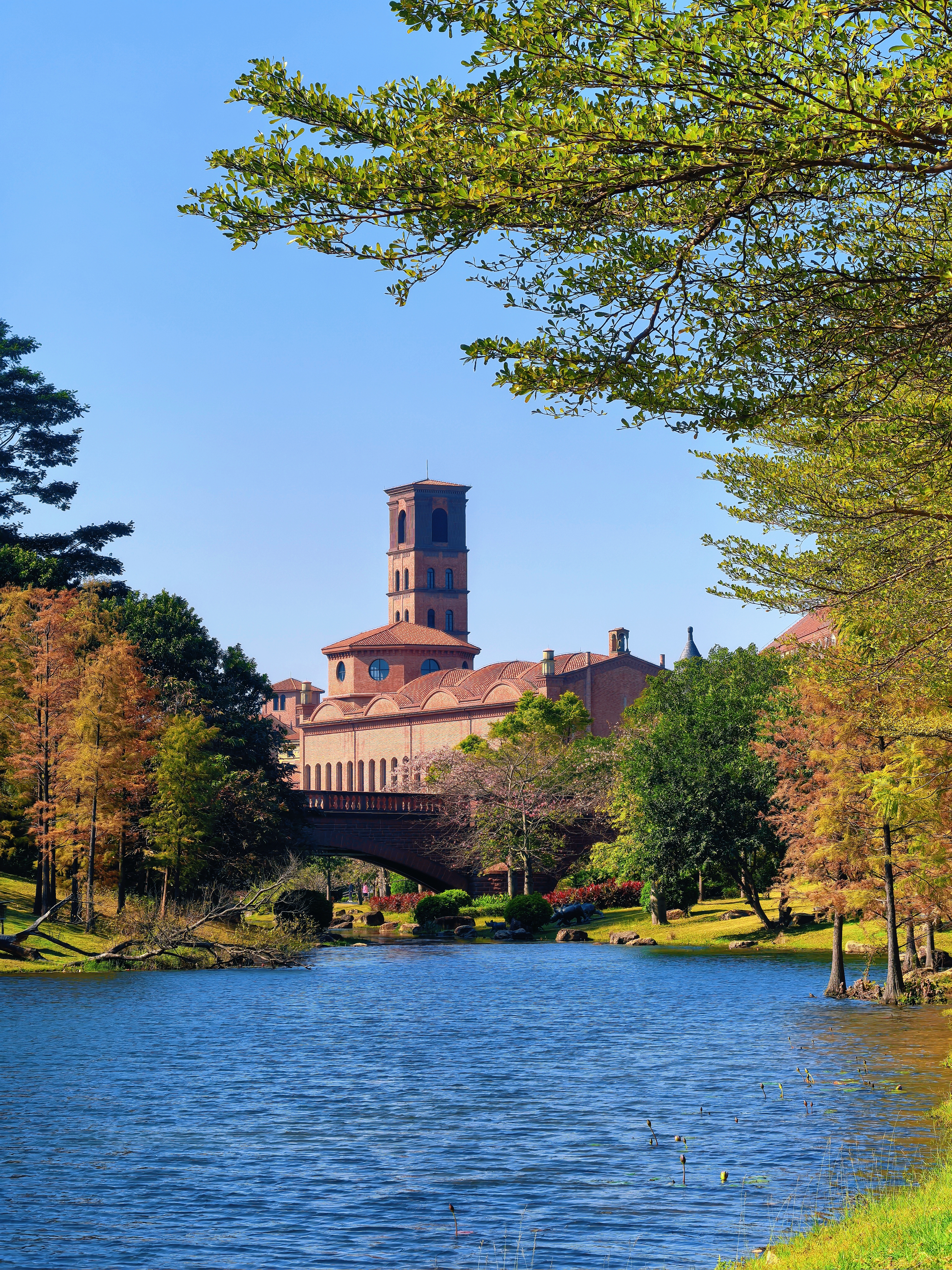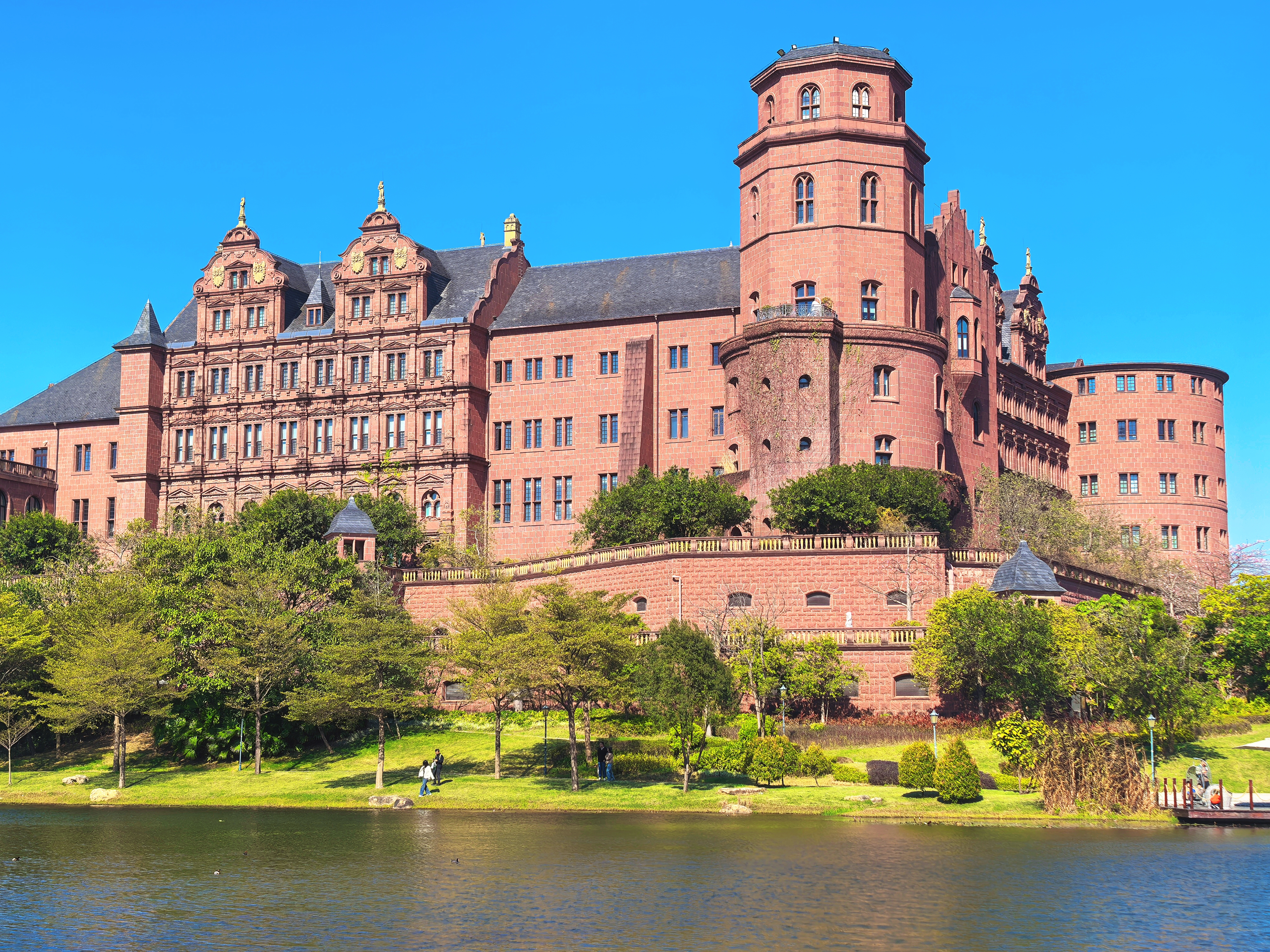 园区内,披着红墙的古堡屹立在湖边,跃动着金光的湖水化为溪流延伸向远处,岸边的密林在微风中轻轻摇曳,偶有几颗树干从溪水中挺拔而出,午后的阳光透过树叶的间隙,在绿茵处洒下一地的斑驳。