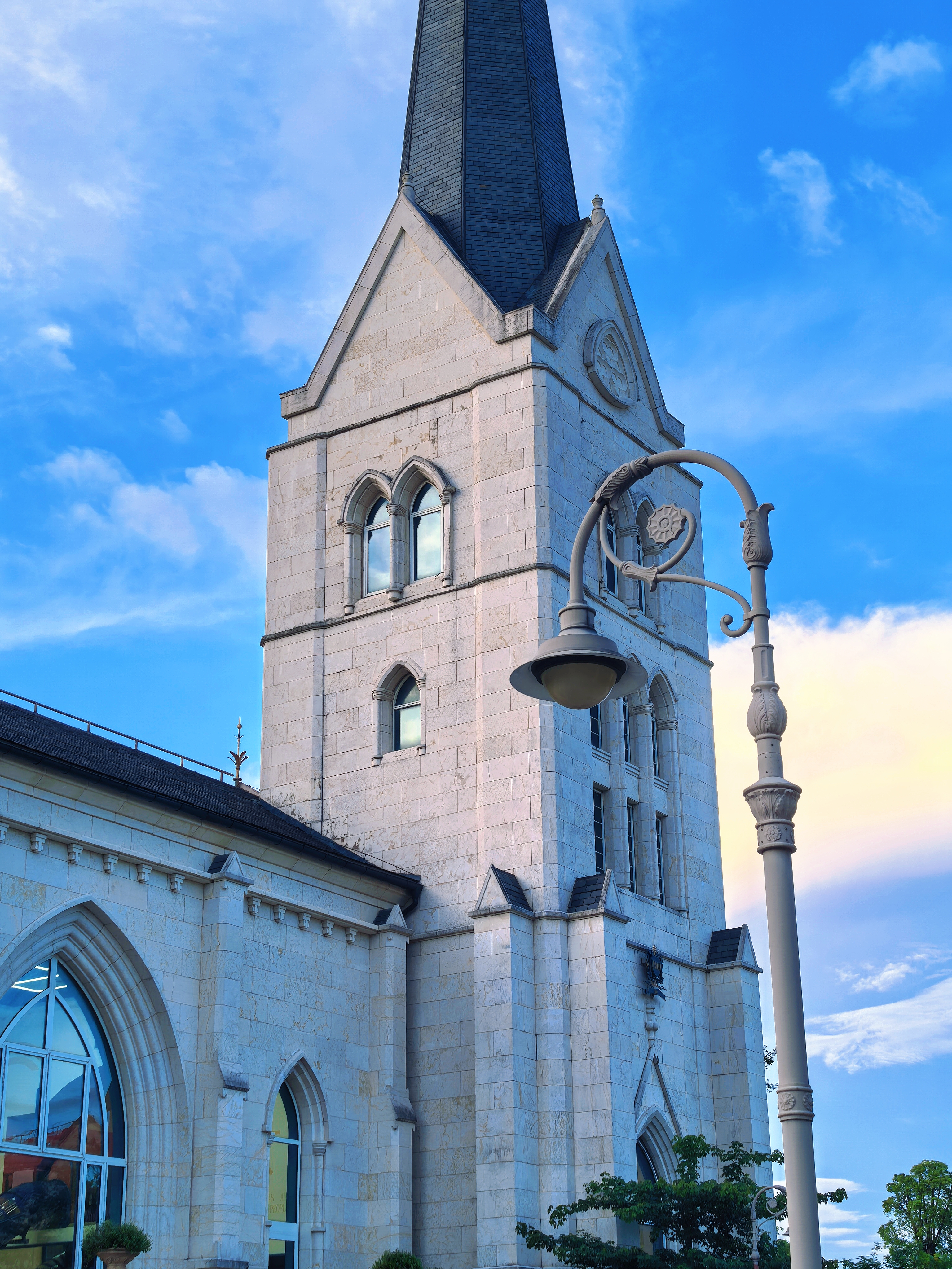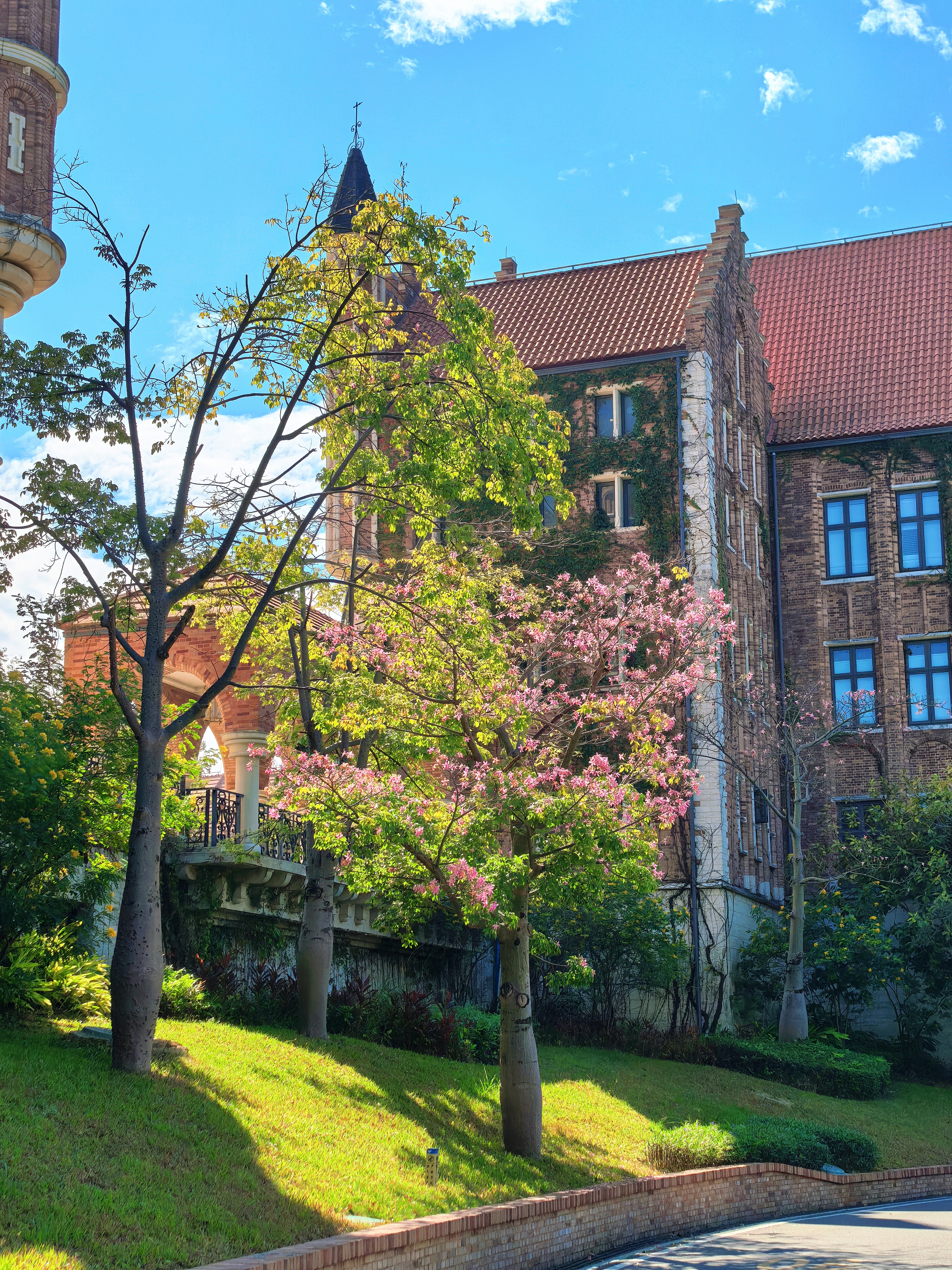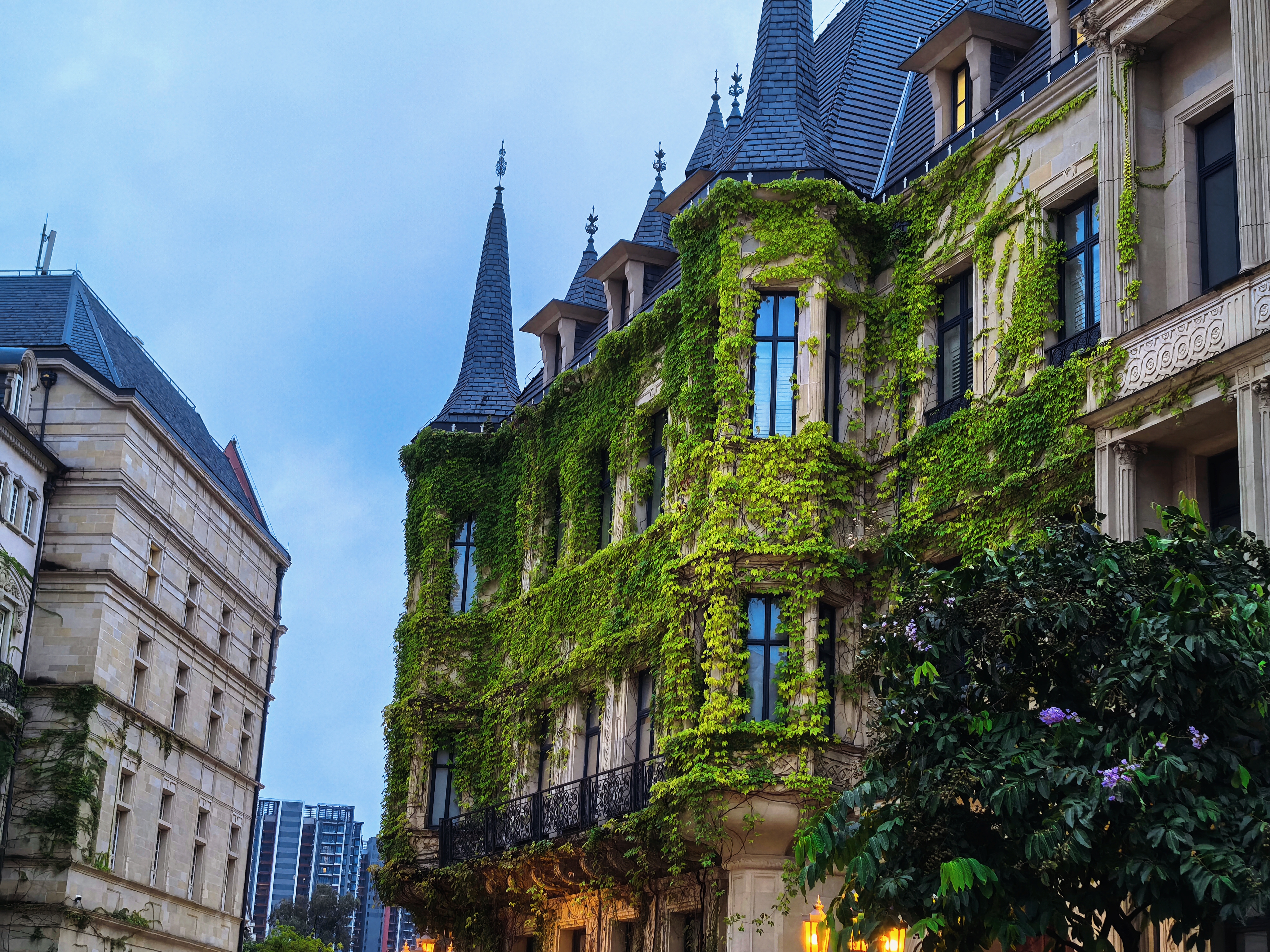 继续往里深入,灰白色的尖塔直插云天,蓝色的塔尖与蔚蓝的天空仿佛融为了一体,古堡的外墙爬满了红枫与藤蔓,为这片建筑平添了几分生机。