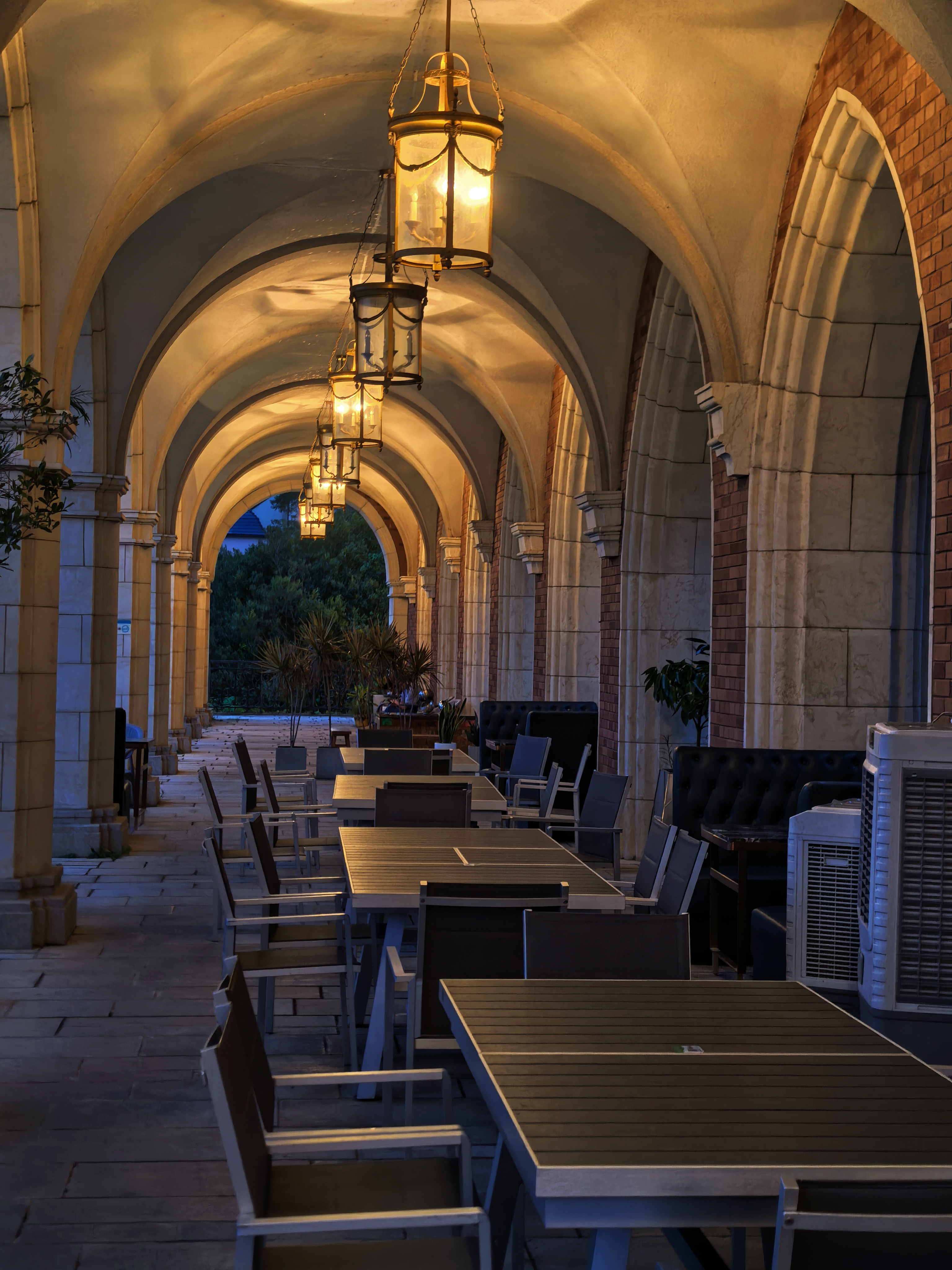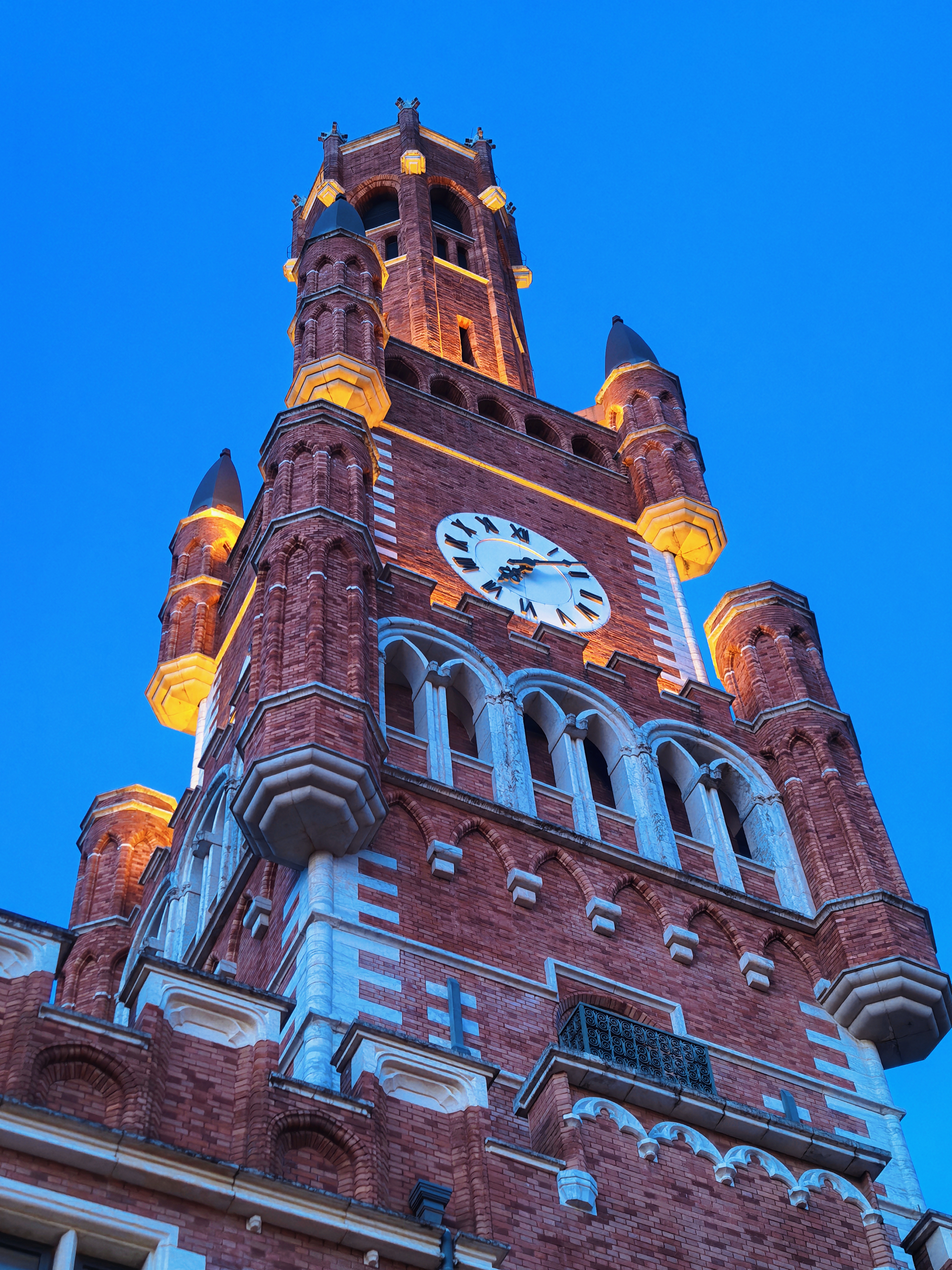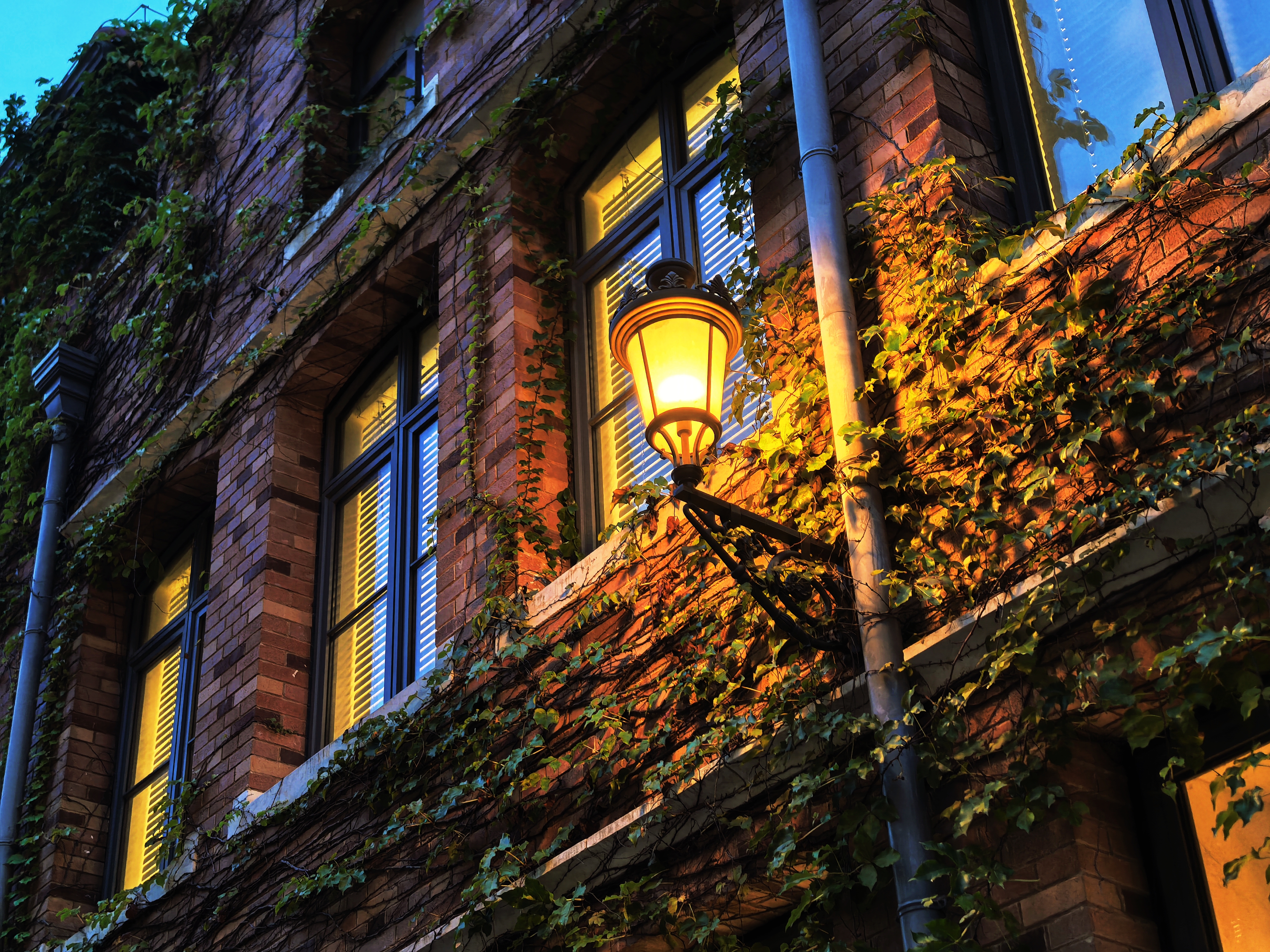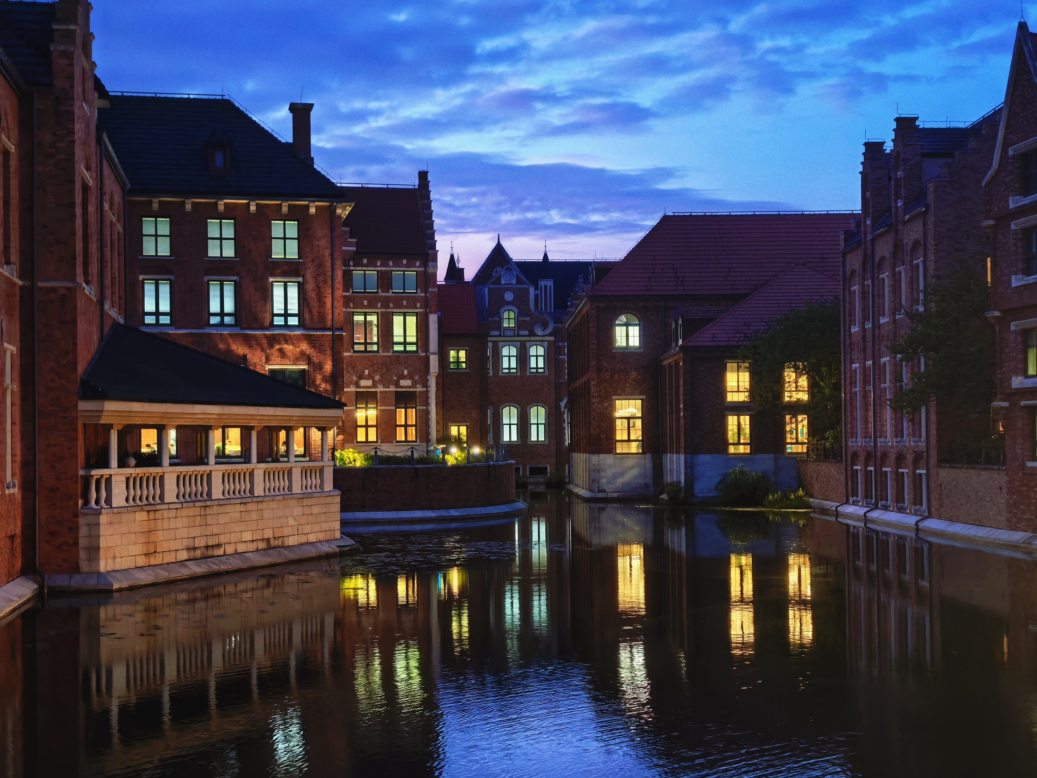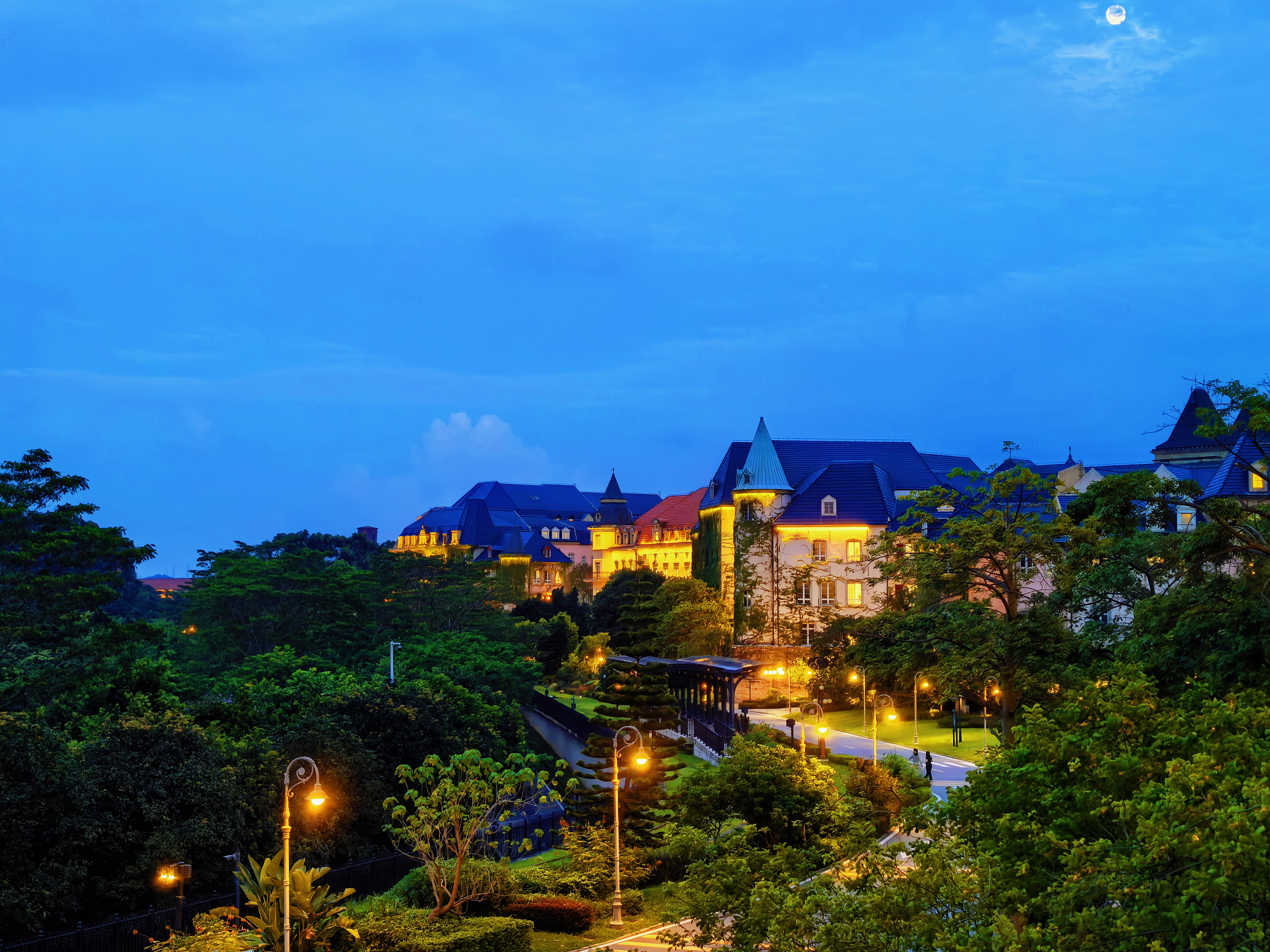 夜幕降临,从窗户透出的灯光倒映在湖面上,就好像有一个镜中世界藏于这湖水之下。路边的街灯也纷纷亮起,昏黄的灯光映照着周围的藤蔓,也照亮了人们前行的路,在这昏暗的环境中给人们带来了一丝安心。钟楼亮起,明月高悬,深蓝的夜空也被照亮,让这座“宫殿”化为一座“不夜城”。离园区很远处,路过的行人也能留意到这一片区域的美丽和独特。