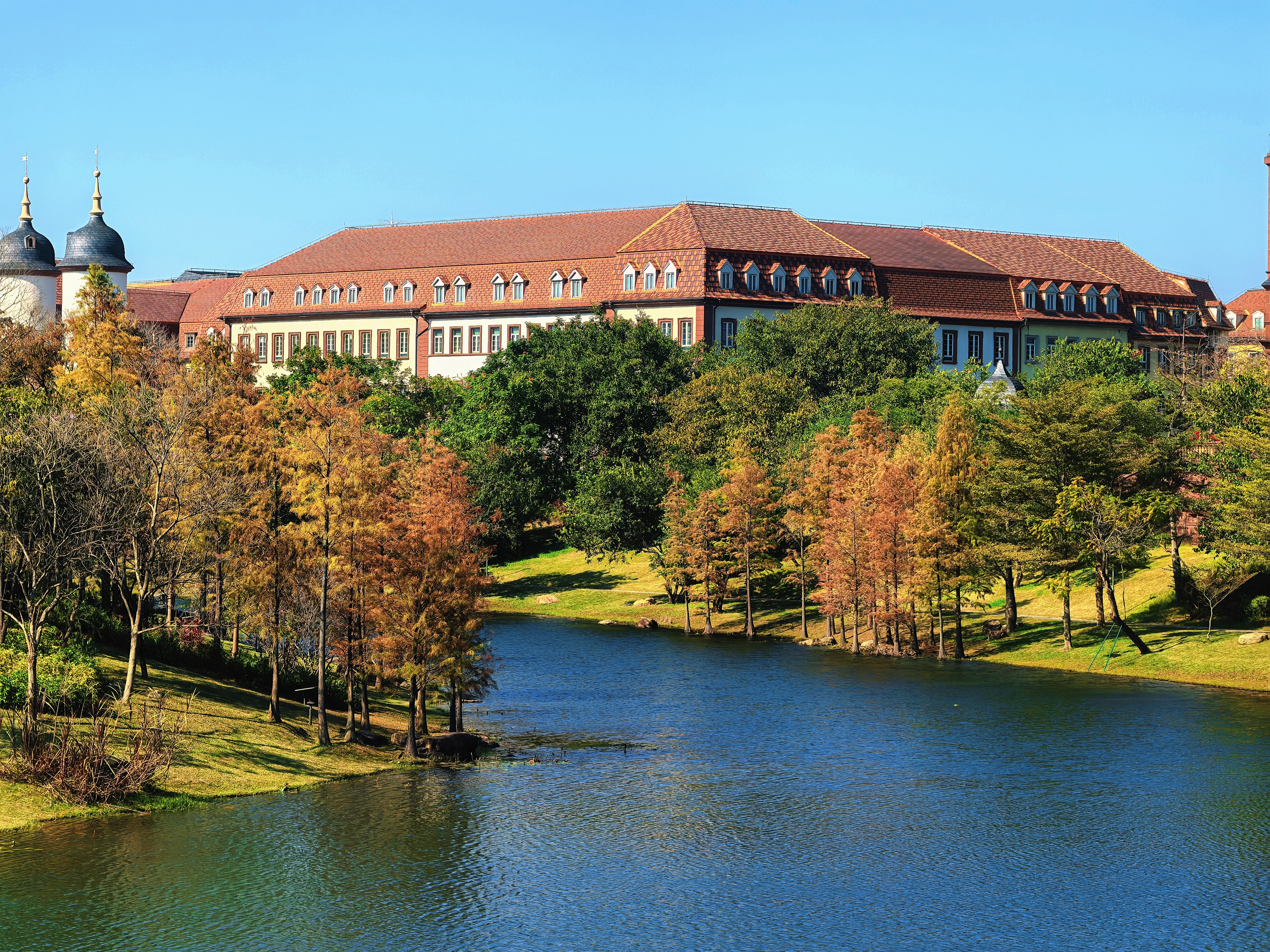 园区内,披着红墙的古堡屹立在湖边,跃动着金光的湖水化为溪流延伸向远处,岸边的密林在微风中轻轻摇曳,偶有几颗树干从溪水中挺拔而出,午后的阳光透过树叶的间隙,在绿茵处洒下一地的斑驳。