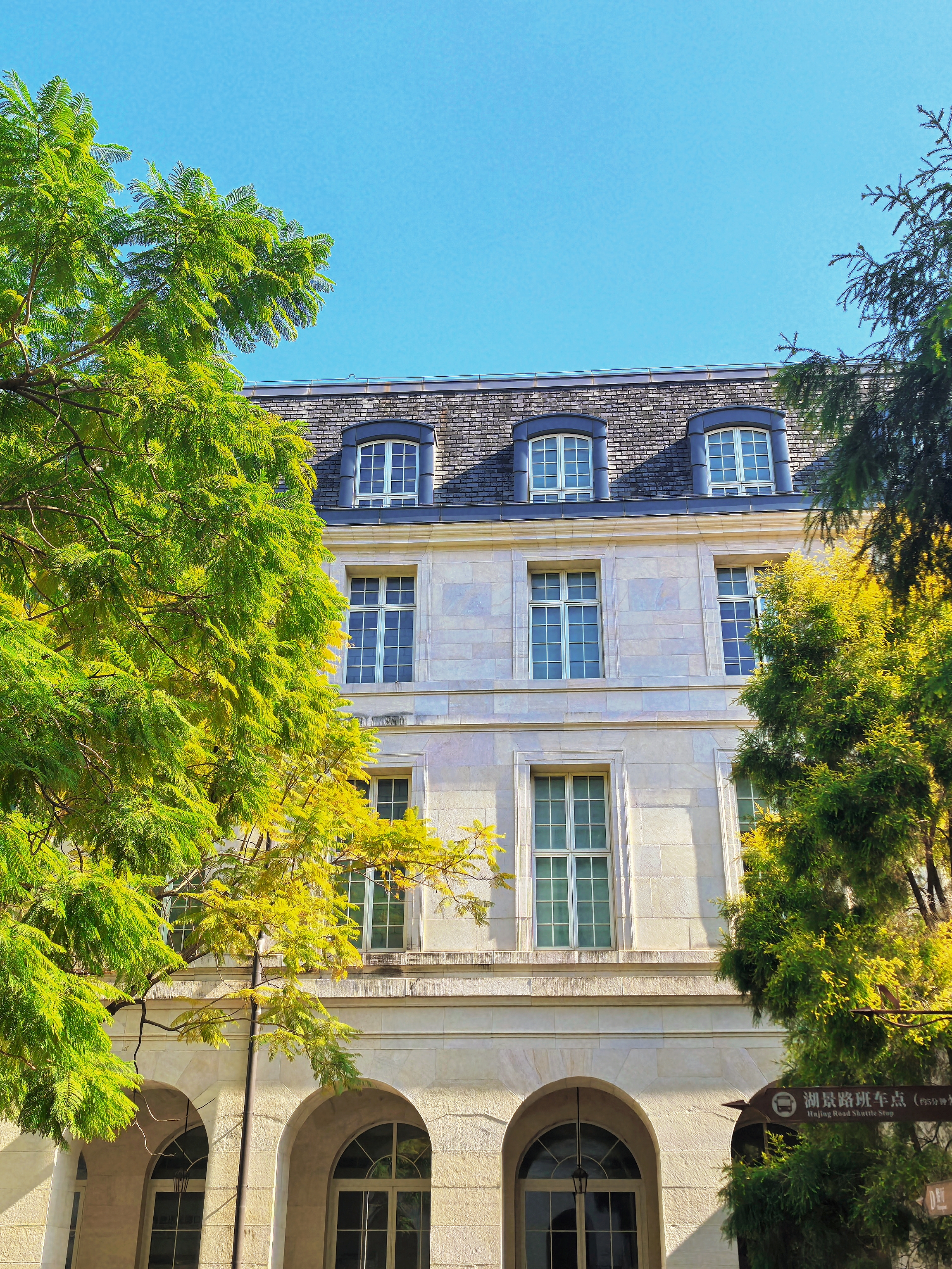 夜幕降临,从窗户透出的灯光倒映在湖面上,就好像有一个镜中世界藏于这湖水之下。路边的街灯也纷纷亮起,昏黄的灯光映照着周围的藤蔓,也照亮了人们前行的路,在这昏暗的环境中给人们带来了一丝安心。钟楼亮起,明月高悬,深蓝的夜空也被照亮,让这座“宫殿”化为一座“不夜城”。离园区很远处,路过的行人也能留意到这一片区域的美丽和独特。