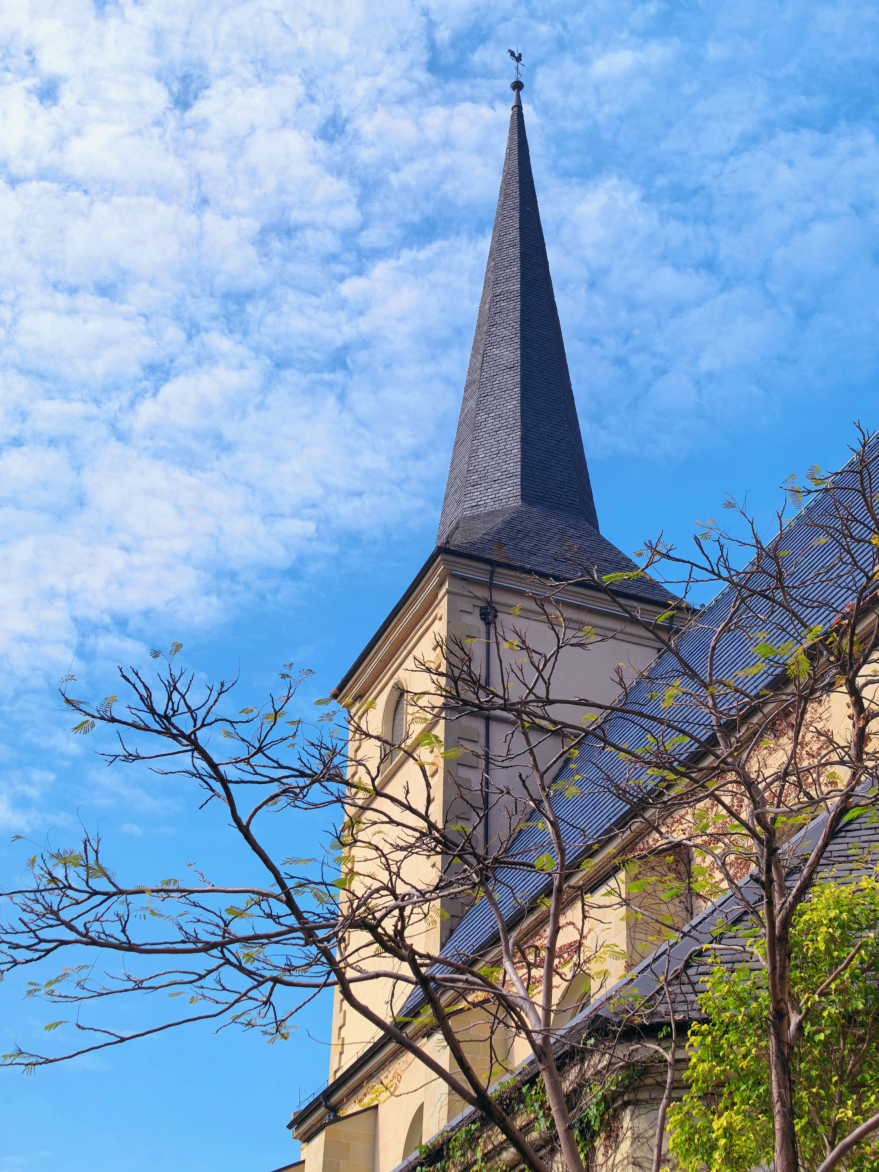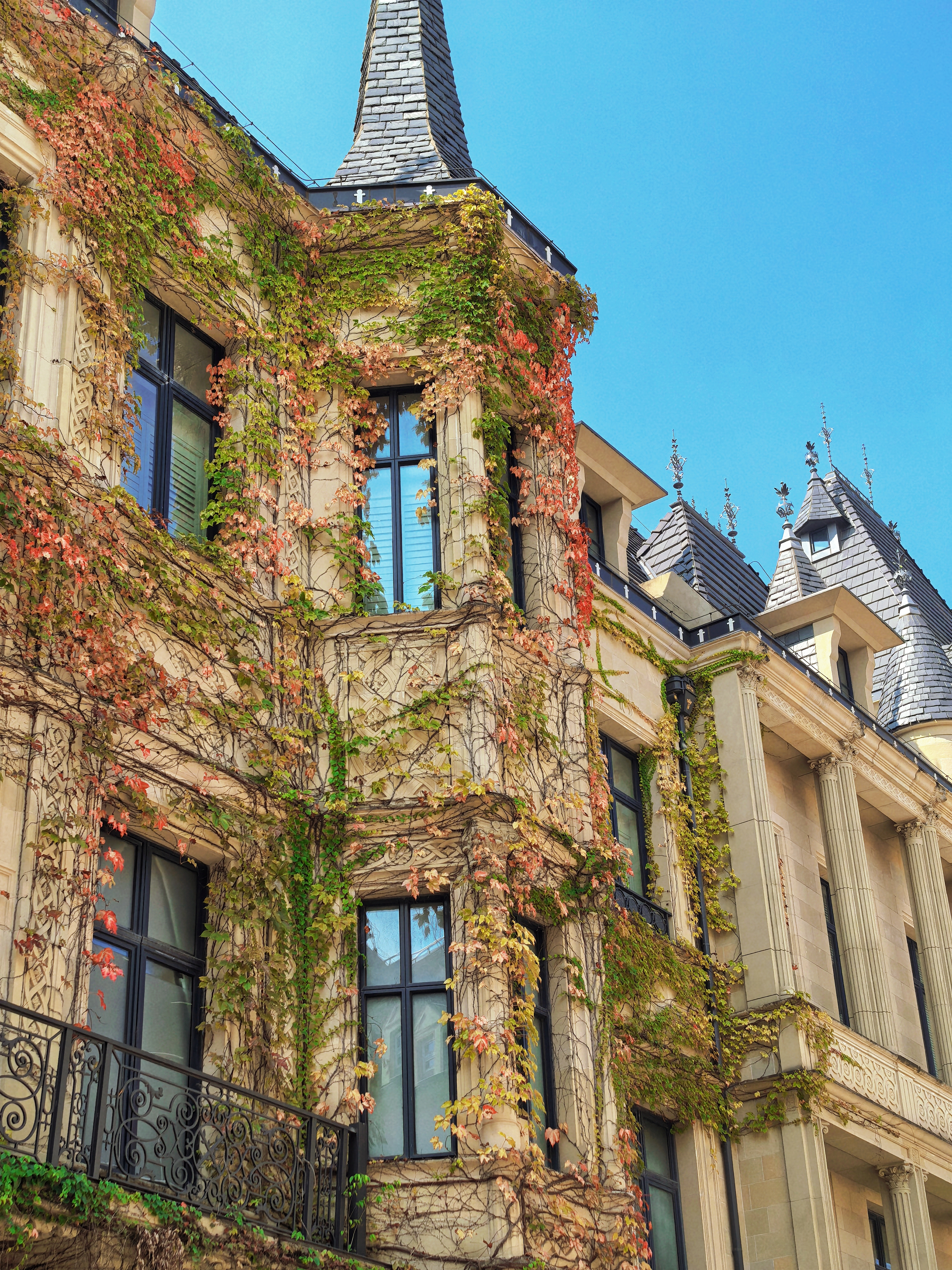 继续往里深入,灰白色的尖塔直插云天,蓝色的塔尖与蔚蓝的天空仿佛融为了一体,古堡的外墙爬满了红枫与藤蔓,为这片建筑平添了几分生机。