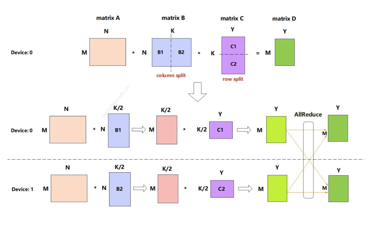 一种经典的切分方式是先“列切”,中间各自做计算,然后再“行切”,最后做一次 AllReduce。通过这种方式,避免了多次 AllGather,只需最后做一次 AllReduce,并且中间值的计算量和存储大小减半。