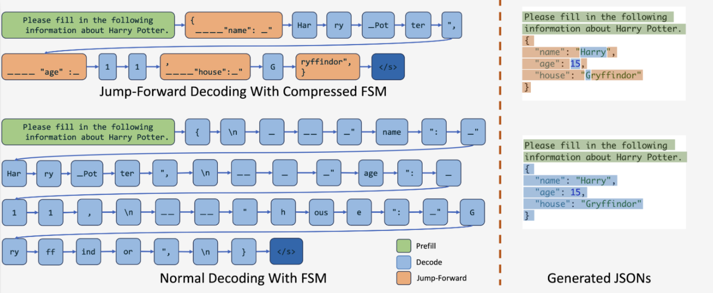 为了解决上述问题,SGLang 提出了一种基于 Compressed Finite State Machine 的 Jump-Forward Decoding。即当生成一些特定的 Token(后续模式固定且可预测,如:{)时,该算法可以在一次 Decode 中将连续的几个 Token 直接生成。