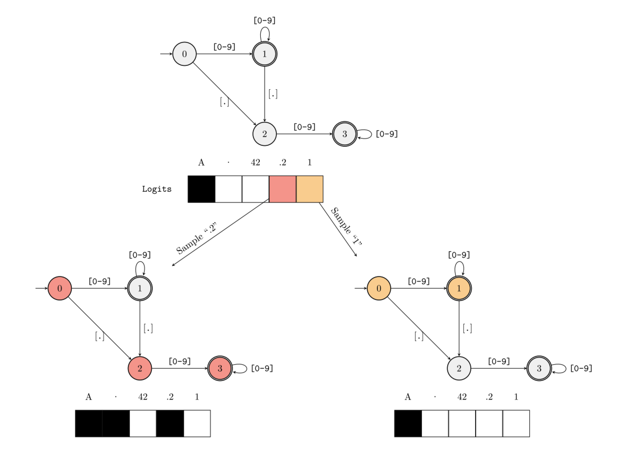 .2(图中用红色表示),此时.2同时满足从状态0过渡到状态2再到状态3的条件,因此 FSM 的当前状态会跳转到状态3并生成下一次采样的 Mask。由于状态3可接受的字符模式仅为[0-9],只有42和1满足,因此此时的 Mask 为[0, 0, 1, 0, 1]; - 模型本轮的采样值为