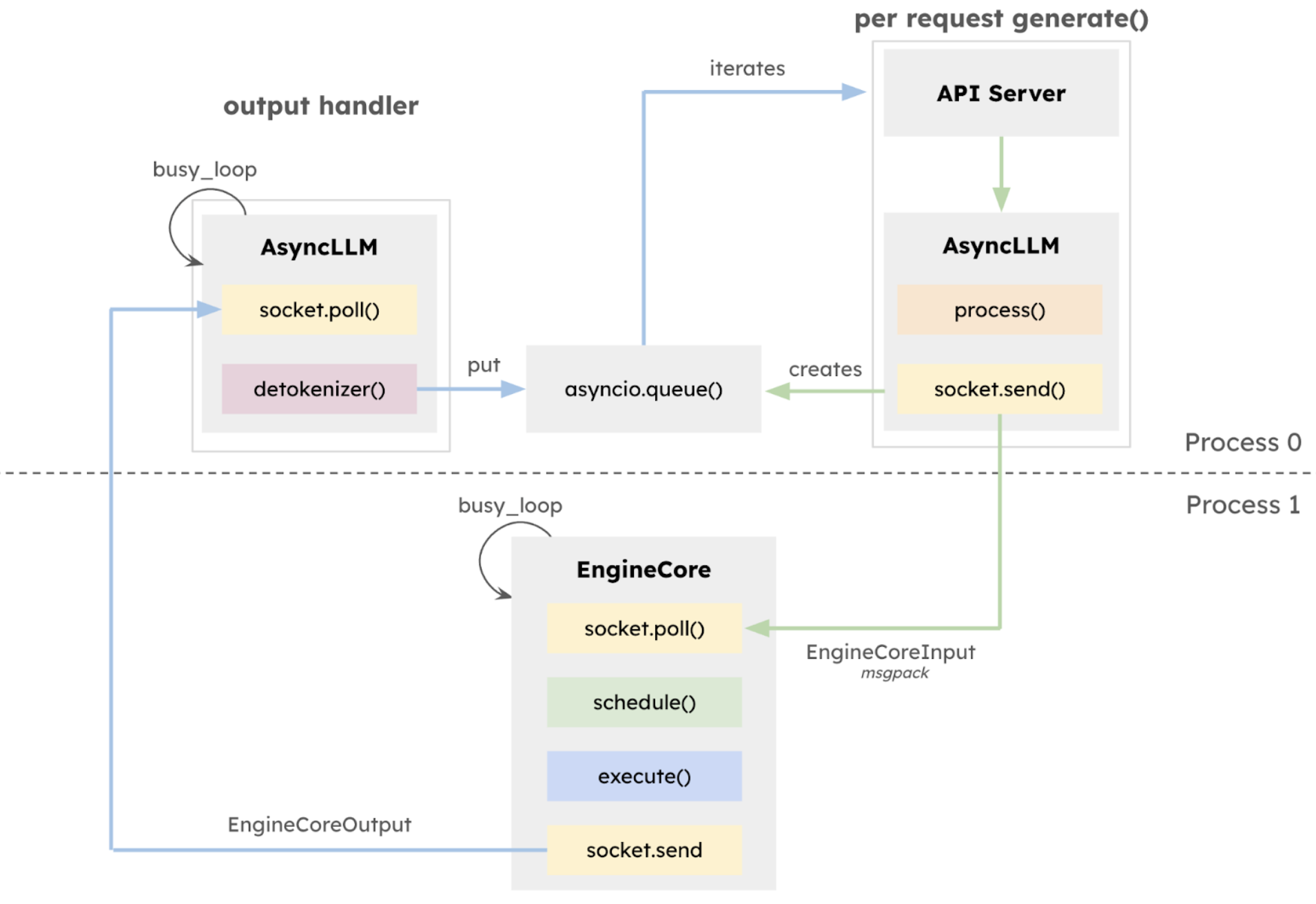 下面是 vLLM 官方博客中提供的 V1 Engine 在线推理架构图。在 V1 中,vLLM 将不同类型的 CPU 密集型操作拆分到了两个相互独立的进程中,以便能够异步执行不同的 CPU 操作,减少了不同步骤之间相互等待的时间,因此能够更好地压榨硬件的计算性能。